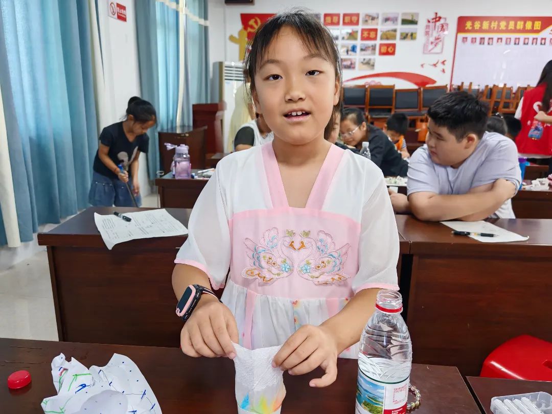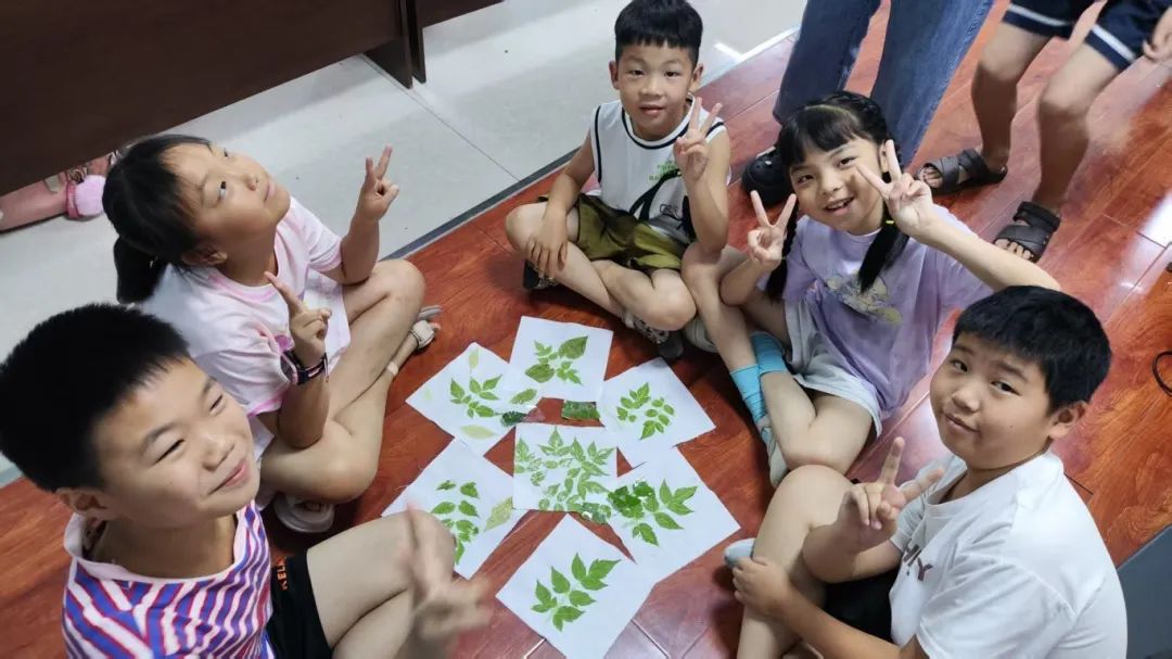 院子里的各种叶片成了天然的颜料。志愿者们铺开白布,教孩子们将叶片固定好,用锤子轻轻敲打——“咚咚咚”,像是在和花草说悄悄话。不一会儿,翠绿的叶纹便印在了布上,有的孩子给作品画了只小蝴蝶,有的添了颗星星,每块手帕都成了独一无二的“夏天印记”。