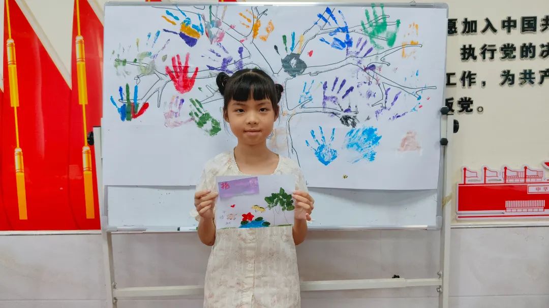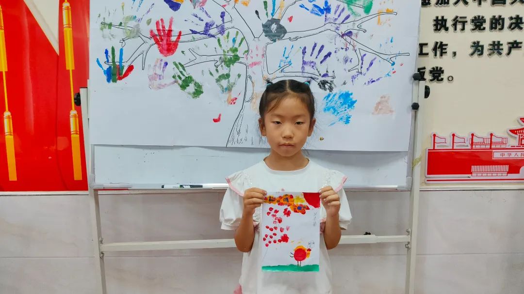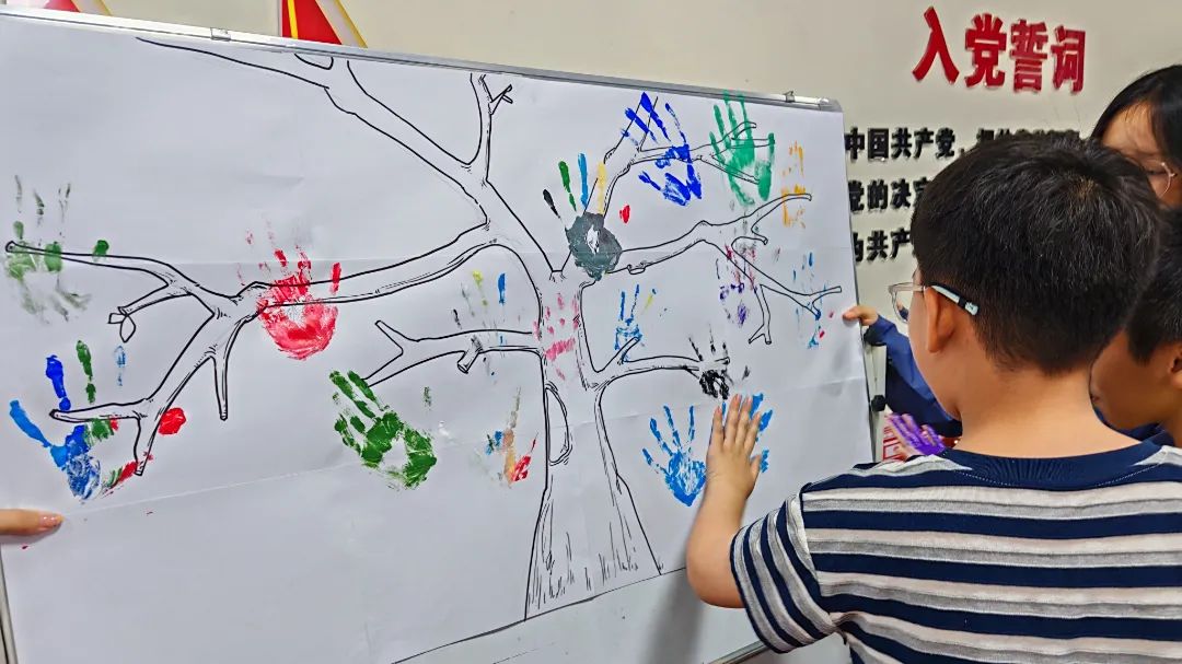 “每个人的指纹都是小宇宙,就像小树上独一无二的叶片。”志愿者的话让孩子们好奇地盯着自己的指尖。他们蘸着颜料,在纸上按下星星点点,有的变成小猫的眼睛,有的连成彩虹。最后,大家排队走到黑板前,在画好的树干上按下彩色巴掌印,光秃秃的树干瞬间“长满”了活泼的“叶子”,像是一片永远不会落叶的森林。