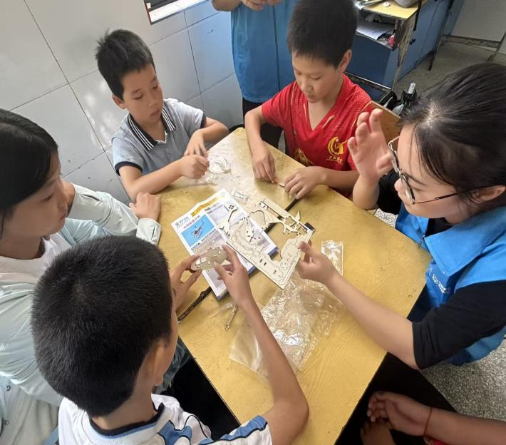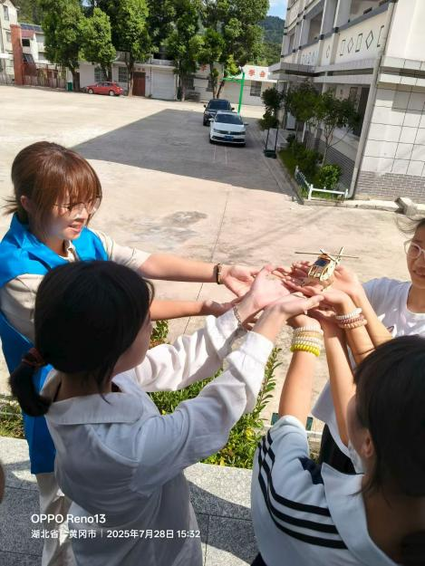 志愿者把团中央捐赠的“两弹一星”科普教具分发给孩子们,手把手教他们组装太阳能飞机模型。当机翼在阳光下转动时,孩子们欢呼着、奔跑着追逐模型,笑声回荡——这既是对亲手创造的惊喜,更是对科技强国的真心赞叹。