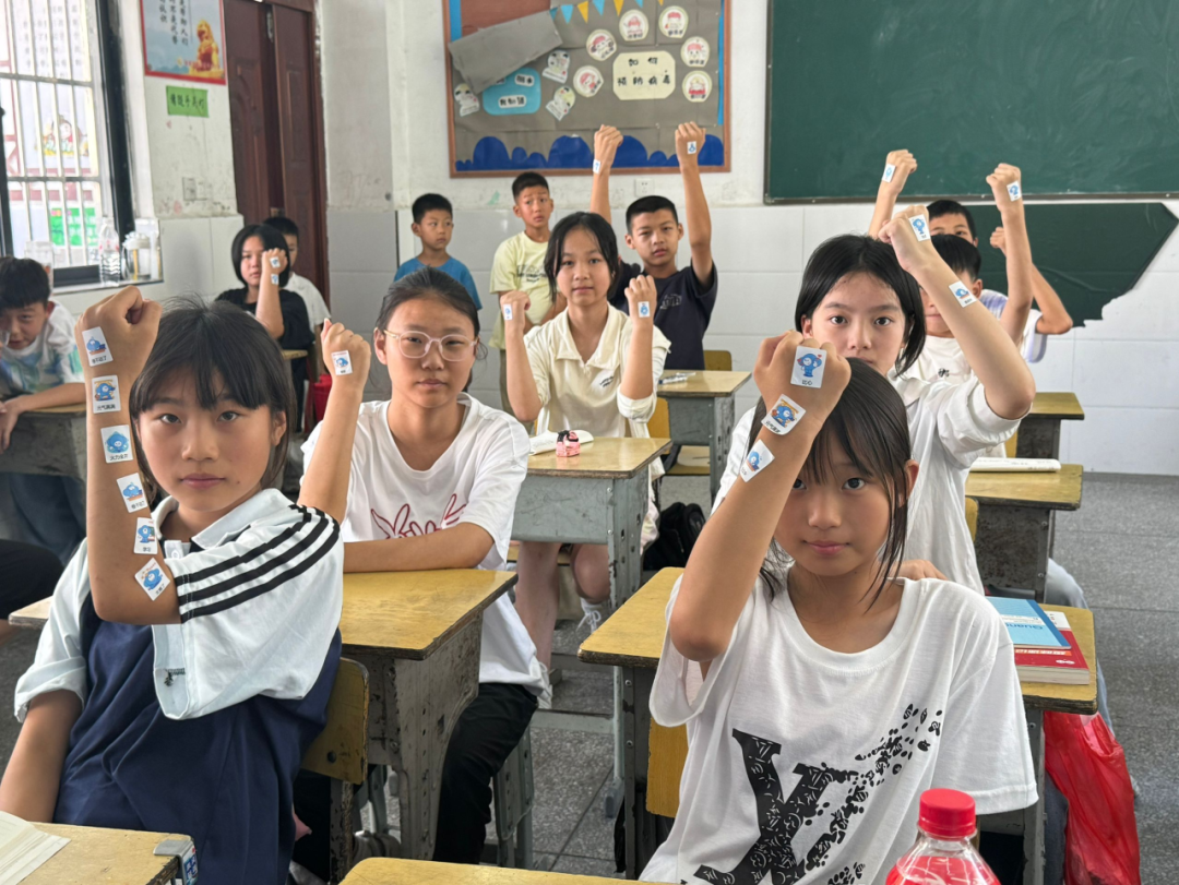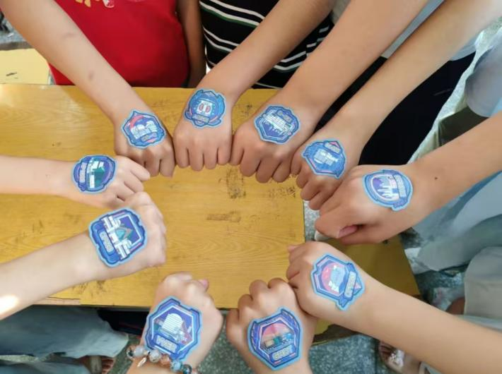 志愿者还为孩子们发放了印着“两弹一星”元素的贴纸,火箭、卫星、蘑菇云的图案在孩子们的掌心熠熠生辉。有的孩子立刻将贴纸贴在胸前,有的小孩将贴纸小心翼翼地夹进课本,仿佛握着一份沉甸甸的向往。