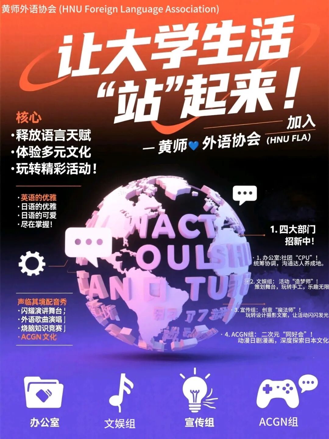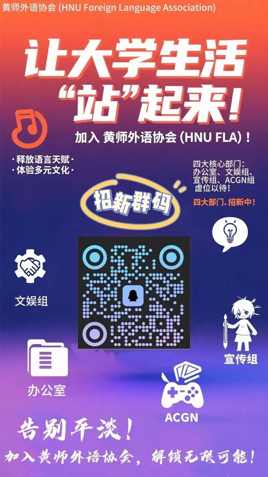 无论你是初出茅庐的小白,还是精通外语的高手,外语协会都有你的一席之地!无需天赋异禀,只要怀揣热爱与有趣灵魂。