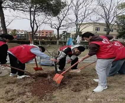 遗爱社工“”三月雷锋行,共同走进福利中心”活动中志愿者们植树场景
