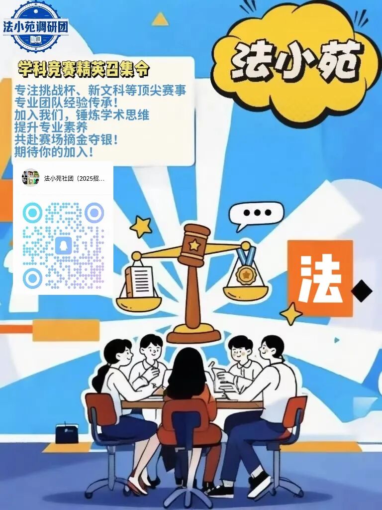 想发表新闻、期刊吗?想在“挑战杯”、“新文科”等重量级学术竞赛中崭露头角吗?法小苑正是你实现梦想的最佳平台与起点!我们是一个曾斩获国家级、省级奖项的团队,有丰富的法学社科类调研的经验传承,加入我们,你将深度锤炼学术思维与专业素养(绝对不局限于法学哦!)获得系统化的竞赛培训与实战模拟,并得到资深导师与获奖学长学姐的倾囊相授。在这里,你能与志同道合的伙伴并肩作战,共同研讨、共同发展、实践创新!