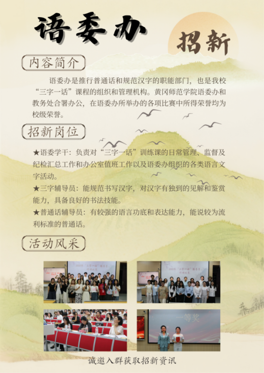 黄冈师范学院语言文字工作委员会办公室简称语委办,我们是推行普通话和规范汉字的职能部门,也是我校“三字一话”课程的组织和管理机构。我们致力于推广规范、优美的语言文字,通过系统化的课程和丰富的实践活动,帮助同学们提升综合素养,展现个人魅力。