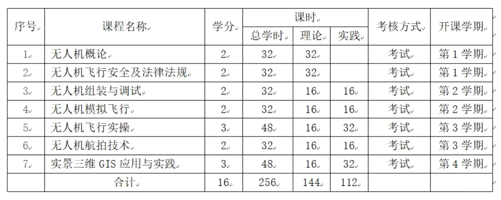设置《无人机概论》《无人机飞行安全及法律法规》等 7 门课程,总学分 16 分,涵盖理论教学(144 学时)与实践操作(112 学时),系统传授无人机知识、技能与行业应用 。