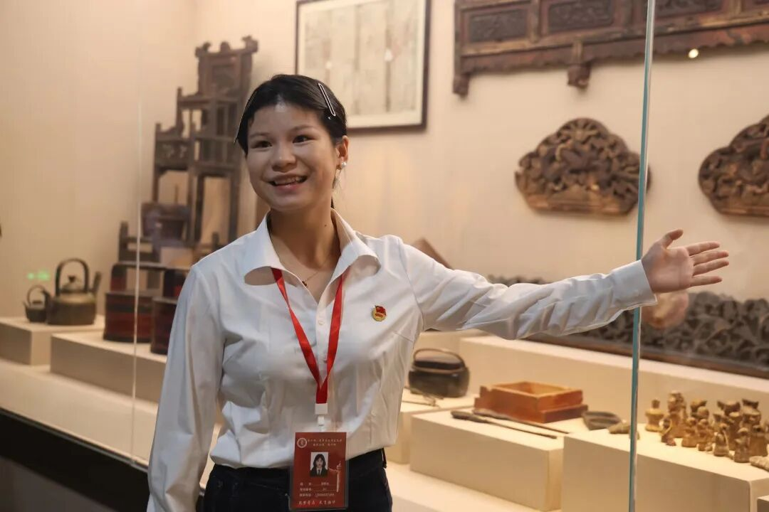 讲解员陈彬冰从建筑、生产、生活、信仰、游艺、服饰六个单元出发,以大别山区典型的农耕生产生活器具和民俗情境为载体,展示大别山地区先民的生活状态与生存智慧,再现横跨鄂、豫、皖三省的独特民俗风情乡土与文化魅力。