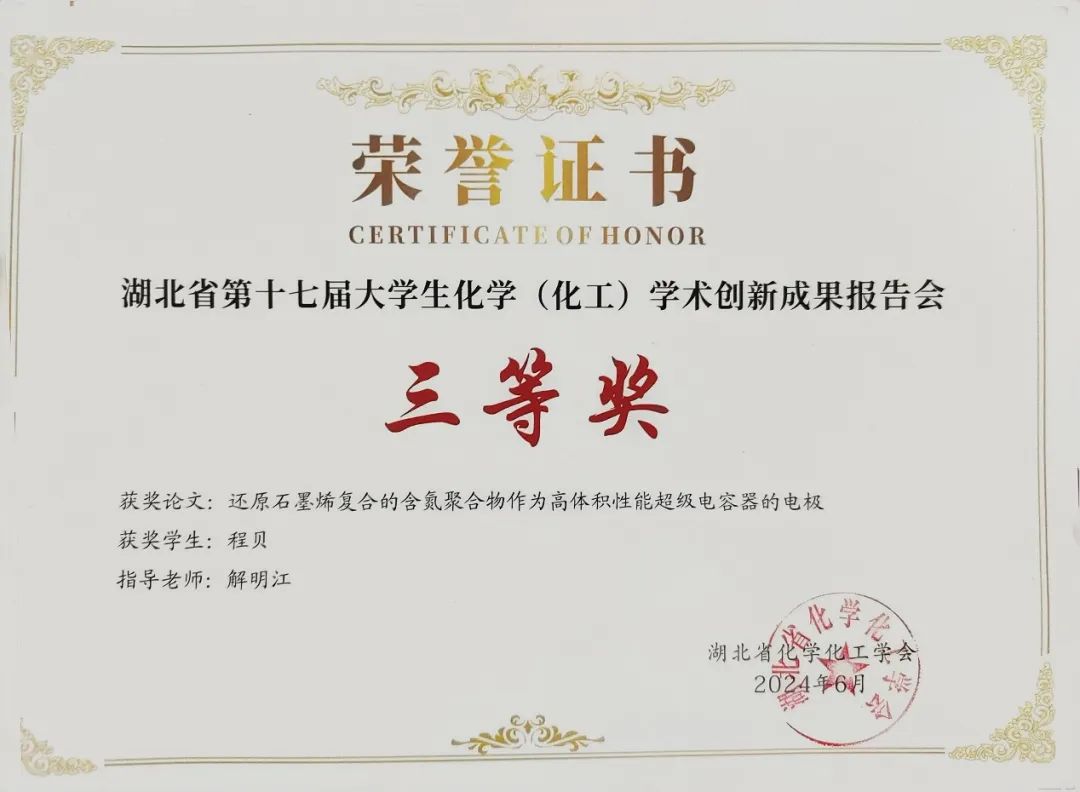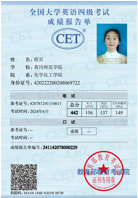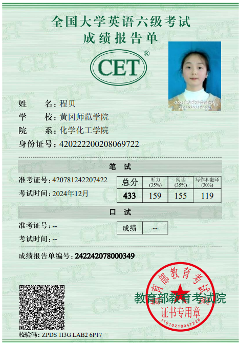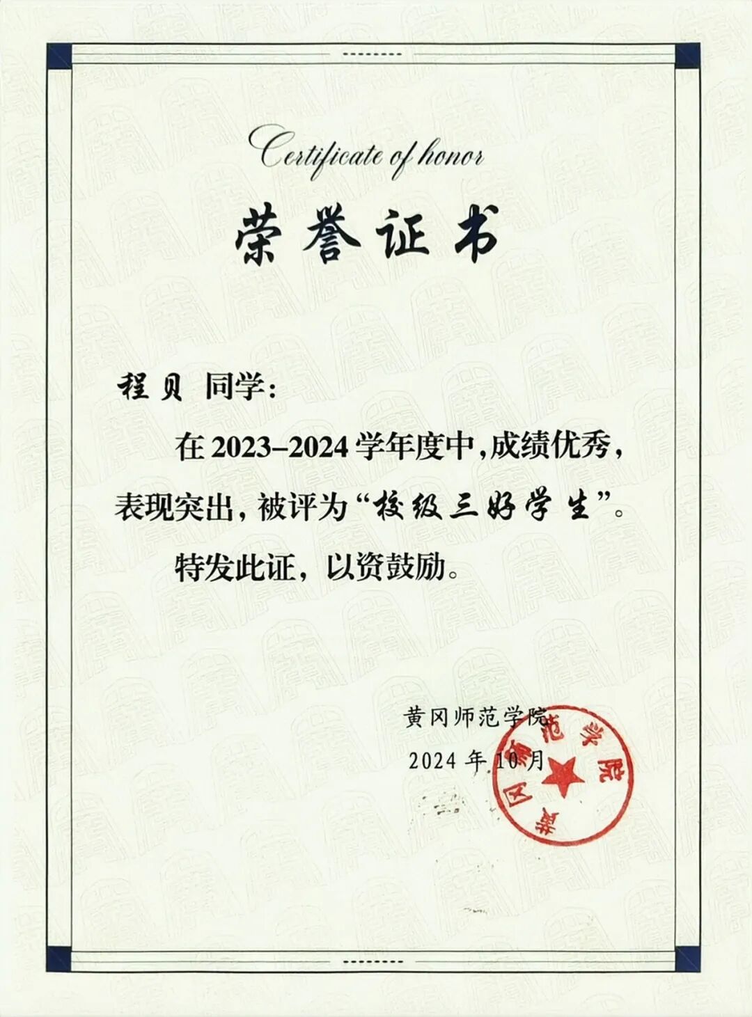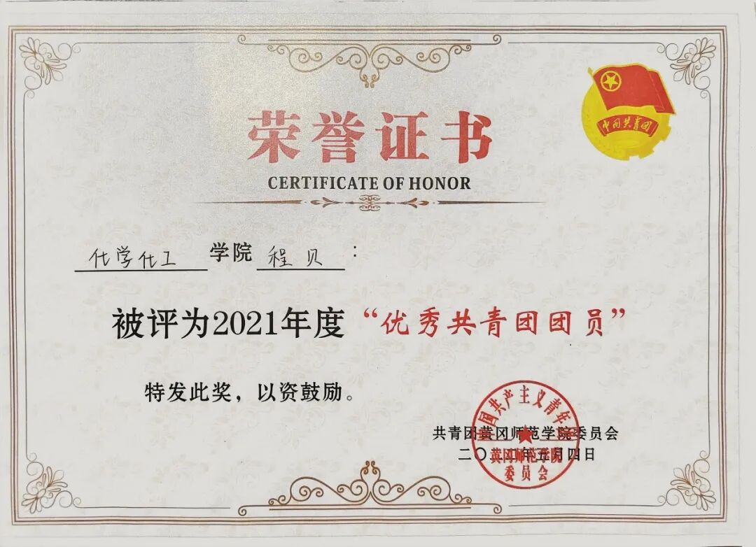 在学术上,程贝始终以勤奋和严谨为座右铭。2023-2024学年,她取得班级成绩第四、综测第一的佳绩,展现了扎实的专业功底。并且她顺利通过英语四六级考试,考取计算机一、二级证书、普通话证书及高中化学教师资格证,并已收到研究生拟录取通知,即将踏上更高的学术征程。