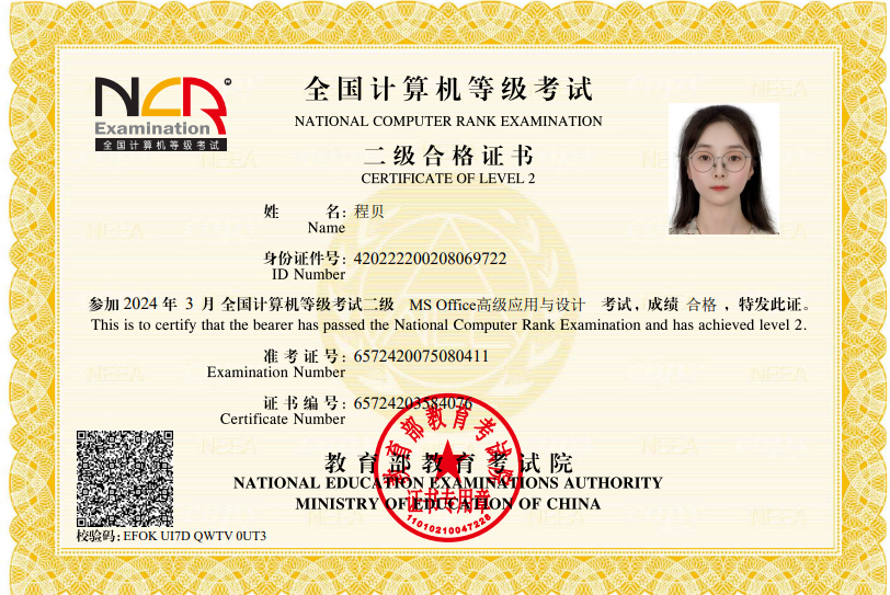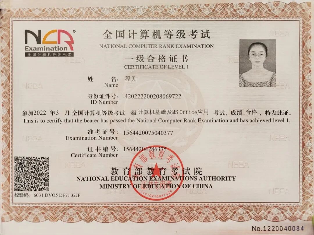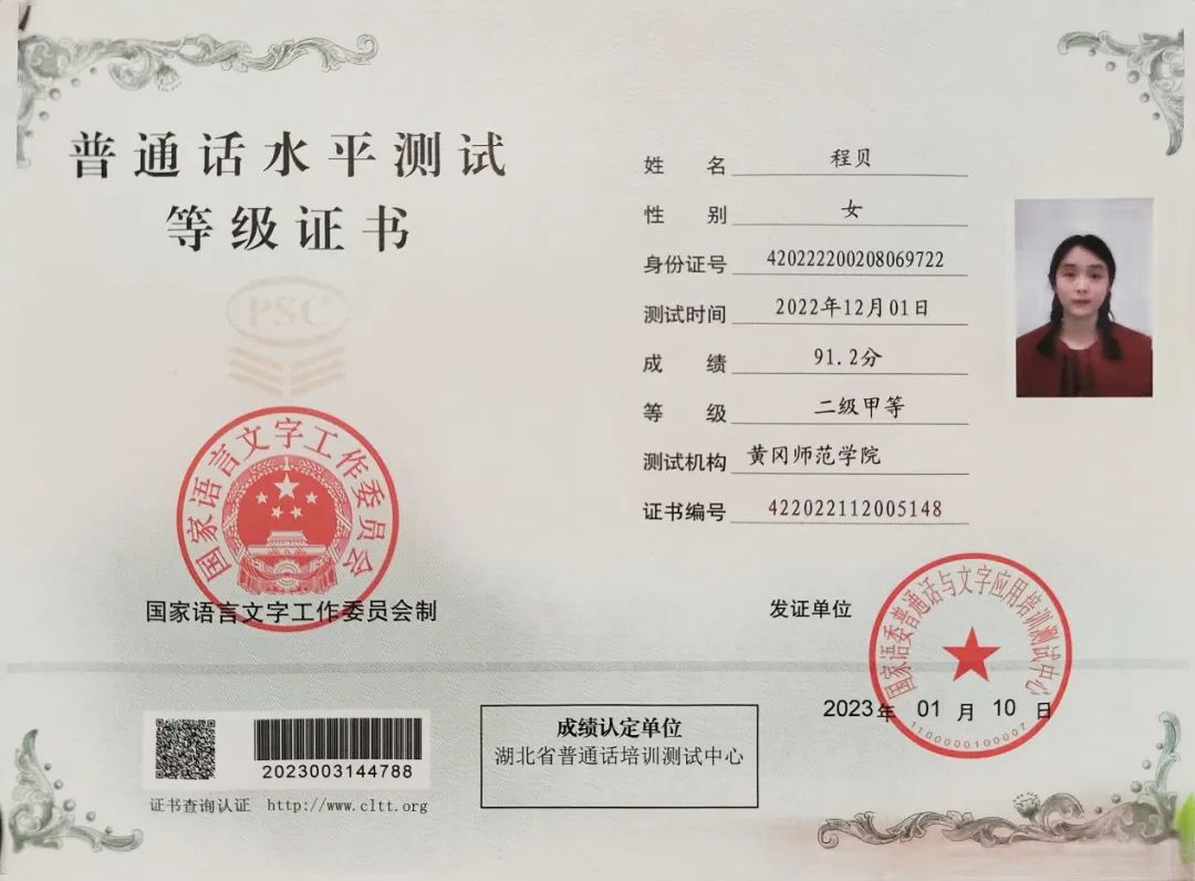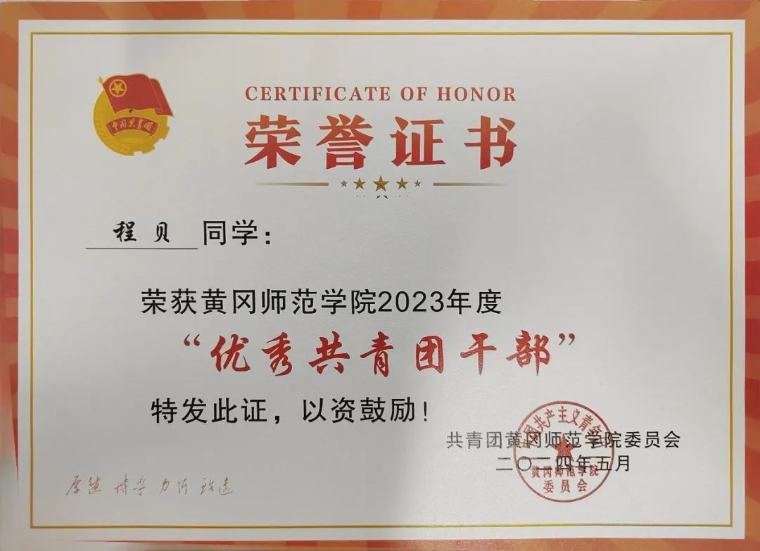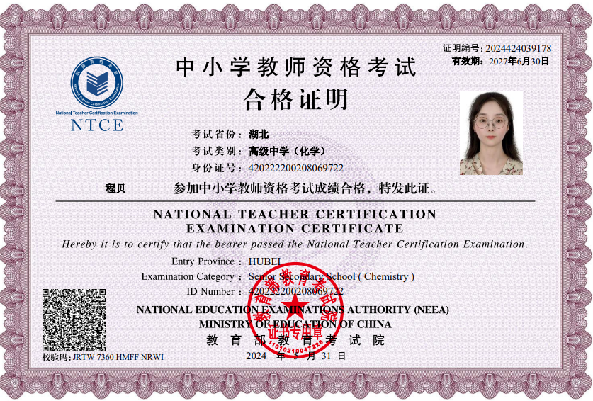 在学术上,程贝始终以勤奋和严谨为座右铭。2023-2024学年,她取得班级成绩第四、综测第一的佳绩,展现了扎实的专业功底。并且她顺利通过英语四六级考试,考取计算机一、二级证书、普通话证书及高中化学教师资格证,并已收到研究生拟录取通知,即将踏上更高的学术征程。