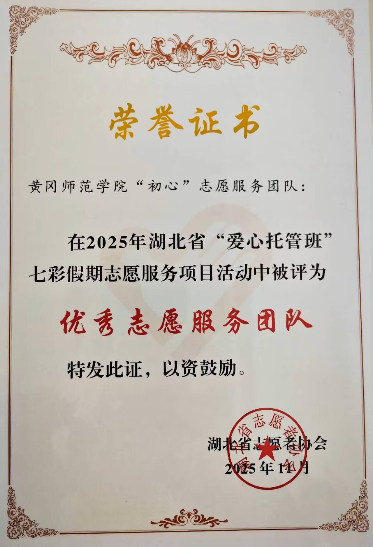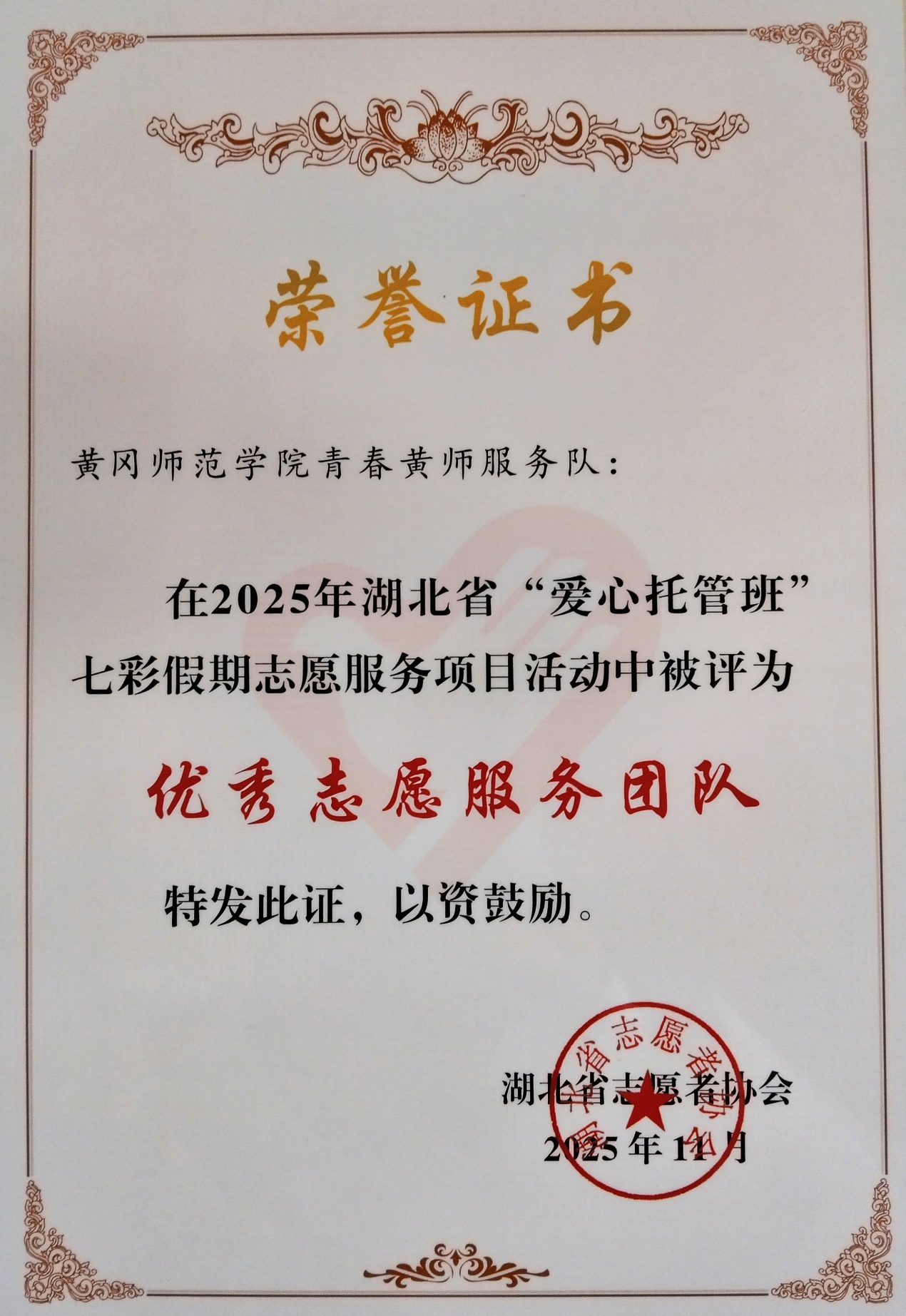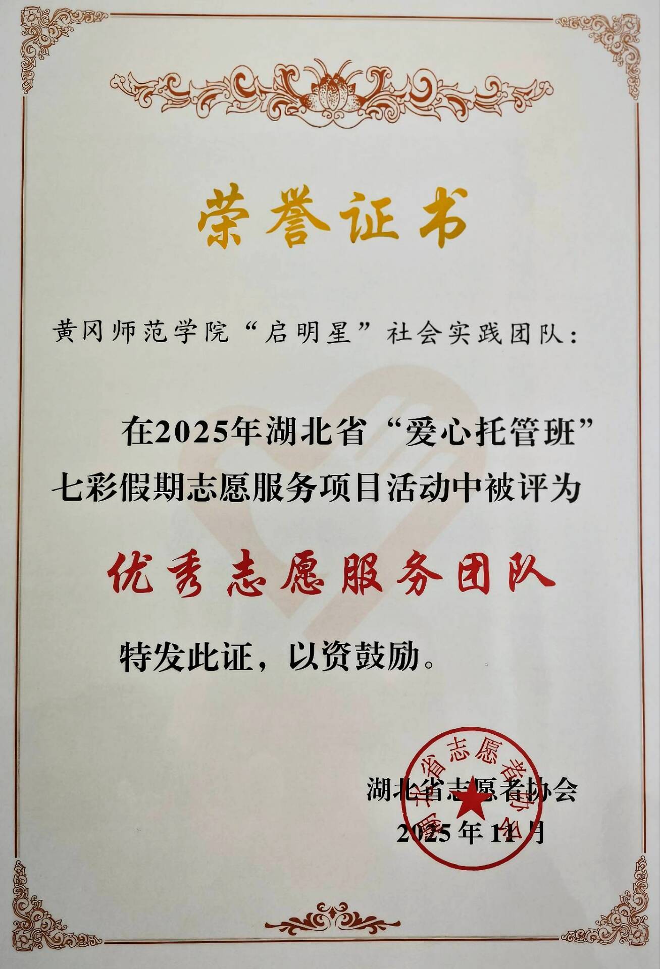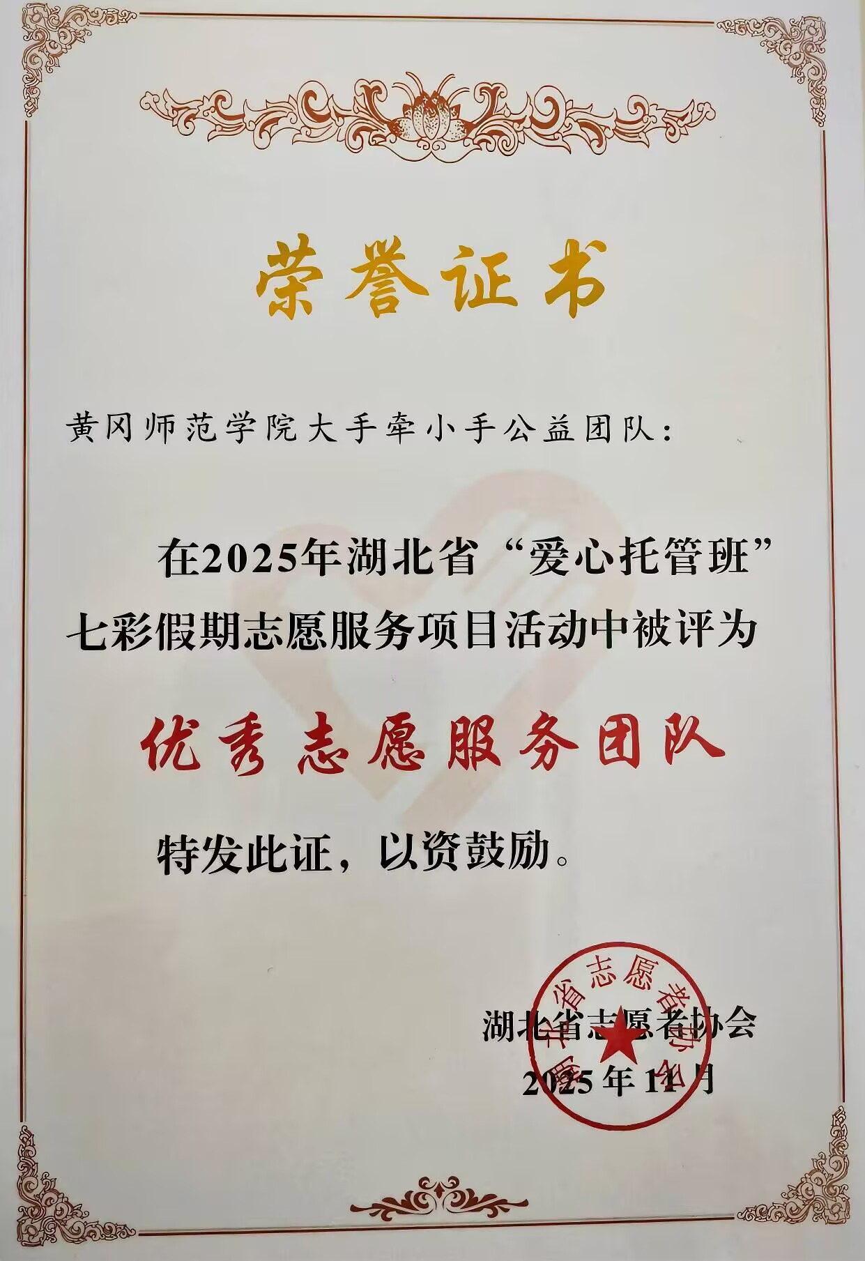 近日,2025年湖北省“爱心托管班”七彩假期志愿服务项目优秀团队入选结果出炉,我校青春黄师服务队、大手牵小手公益团队、“启明星”社会实践团队、“初心”志愿服务团队凭借扎实的服务成效与强烈的责任担当,获评“优秀志愿服务团队”荣誉称号。