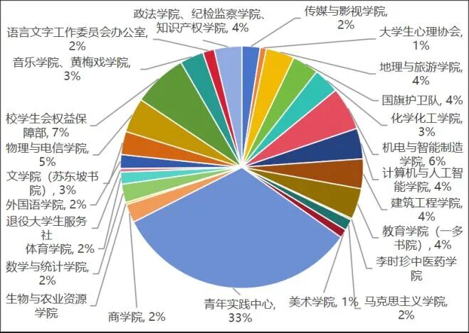 从各组织发布活动数量占比来看,青年实践中心发布活动数量最多,占比33%,其次校学生会权益保障部、机电与智能制造学院、物理与电信学院发布活动数量较多,占比均大于4%;其他各组织也能够积极开展各类志愿服务活动。希望各组织进一步挖掘志愿服务资源,创新活动形式与内容,吸引更多同学投身其中,助力同学们在志愿服务中增长见识、锤炼本领,促进个人成长与社会发展的良性互动。