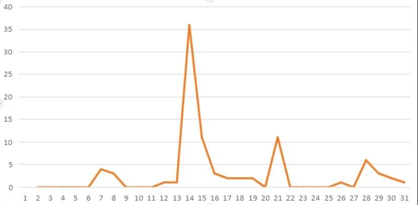从9月每日发布的志愿服务活动数量来看,因开展迎新活动,每日活动数量在9月13日达到峰值;九月份活动开展的数量最多的一天有36个活动。但本月活动存在每日活动数量波动较大的问题,希望各组织能够积极开展志愿服务活动,为大学生提供更多参与志愿服务活动的机会,丰富大学生的社会经验,培养志愿服务精神。