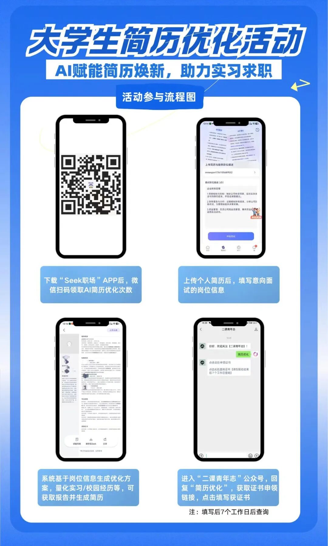 4.证书申领:进入“二课青年志”公众号,回复“简历优化”,获取证书申领链接,点击填写获证书。