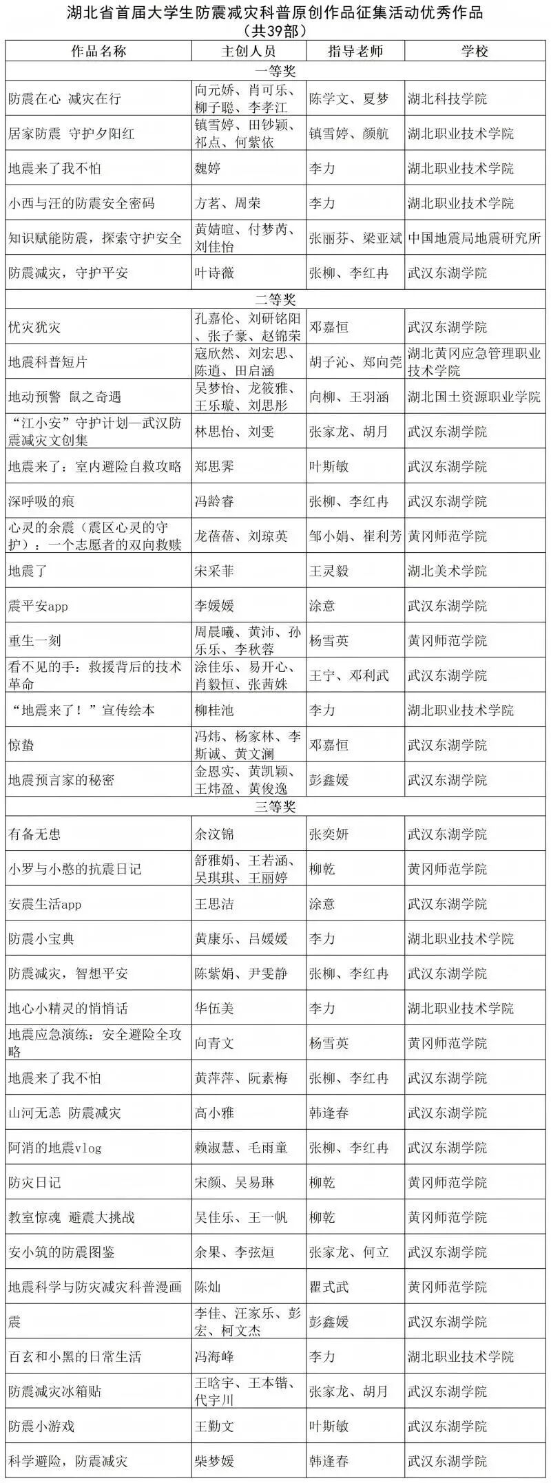 近日,由湖北省地震局、省科学技术协会、省应急管理厅联合主办的湖北省首届大学生防震减灾科普原创作品征集活动评选结果正式揭晓。我校学子踊跃参与、匠心创作,以扎实学识与创新思维积极投身科普实践,共报送25项优质作品。经层层筛选、严格评审,7项作品从众多参赛佳作中脱颖而出,成功斩获省级荣誉——其中二等奖2项、三等奖5项,用实力彰显了我校学子的综合素质与责任担当!