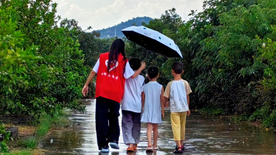 雨丝裹着风,积水在田埂路上泛起涟漪。志愿者撑着偏斜的伞走在最前,红马甲的边角被风掀起。她的目光不时落在身后三个孩子的脚上,轻声提醒着“踩这里”。孩子们小小的身影跟着她,走在那片倾斜的、暖烘烘的阴影里。