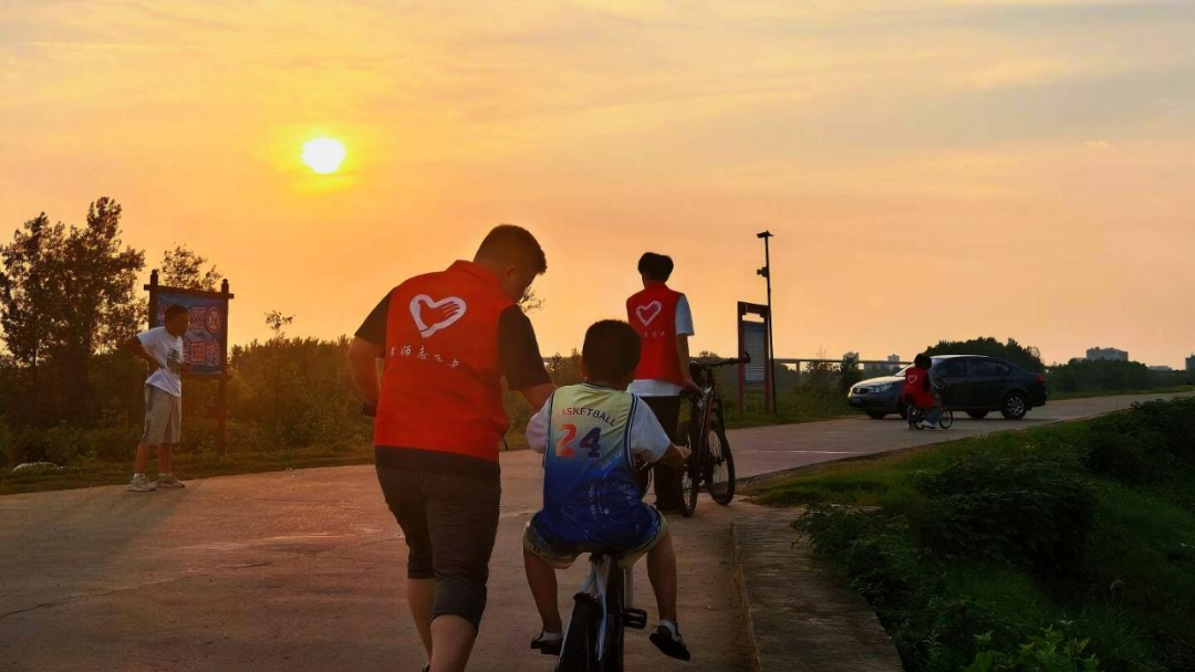 傍晚夕阳染红天空,大坝上微风轻拂。志愿者陪伴小朋友骑行,在暮色中缓缓前行。这一刻,陪伴化作温暖的力量,让关爱在自然与光影中流淌。这不仅是一次散步,更是心与心的贴近,是成长路上的温暖陪伴。