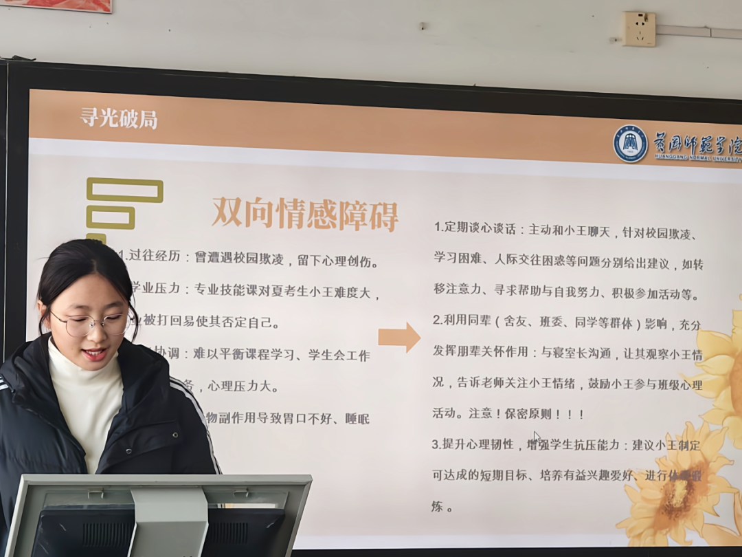 互动环节,“十佳现场心理委员”以饱满的热情和轻松的语言积极引导,充分调动大家的参与积极性,使心理委员们在愉悦的氛围中学习思考、获得成长。
