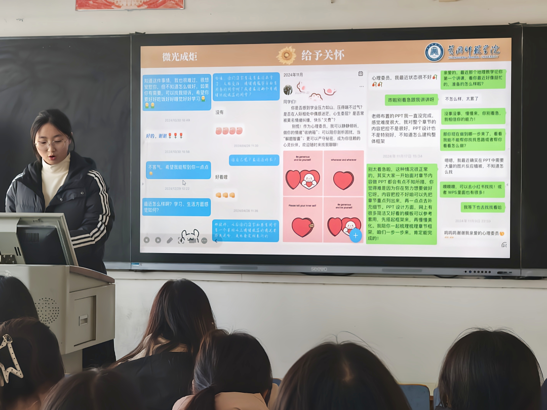 培训中,“十佳心理委员”结合自身工作实践,围绕职责定位、日常体会与经验心得等内容展开分享,通过丰富的课件展示、生动的活动照片与视频资料,拉近了与新生心理委员的距离,也为后续工作指明了方向。
