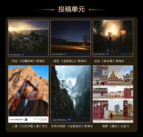 赛事以“把周末拍出彩”为主题,征集反映中国山水风景、人文特色、城市精神、时代发展成就、中华优秀传统文化等内容的手机摄影作品,分为“长焦与微距” “组图”“风光”“人像” “夜色” “运动”6个单元(投稿作品的手机品牌、型号不限,特别征集由vivo手机拍摄的作品)。