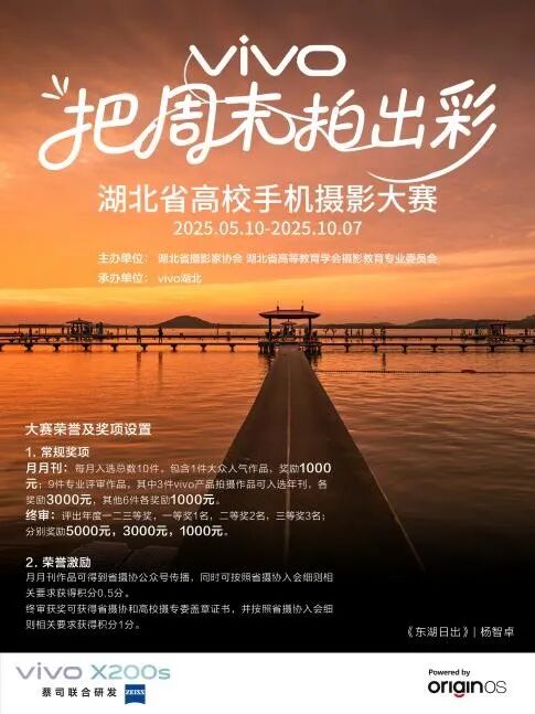 湖北省高校手机摄影大赛是由湖北省摄影家协会、湖北省高等教育学会摄影教育专业委员会携手vivo湖北特联合举办的湖北省高校手机摄影大赛。