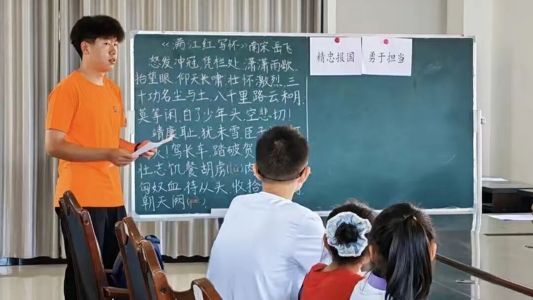 我是体育学院 “初心” 志愿队成员孙飞,我积极参与“三下乡”志愿服务,扎根乡村暑期学堂支教一线。聚焦青少年爱国教育,开设《满江红》诗词品读课堂,以岳飞生平为引,结合实景插画与历史影像,生动解读 “精忠报国” 精神,带领孩子们沉浸式感悟家国情怀。同时还设计朗诵教学与互动竞赛,以专业耐心传递正能量,让红色精神浸润童心。积极发布推文,扩大活动影响力,以青春之力践行志愿担当,用实际行动诠释青年服务基层的初心,尽显黄师学子的责任与热忱。