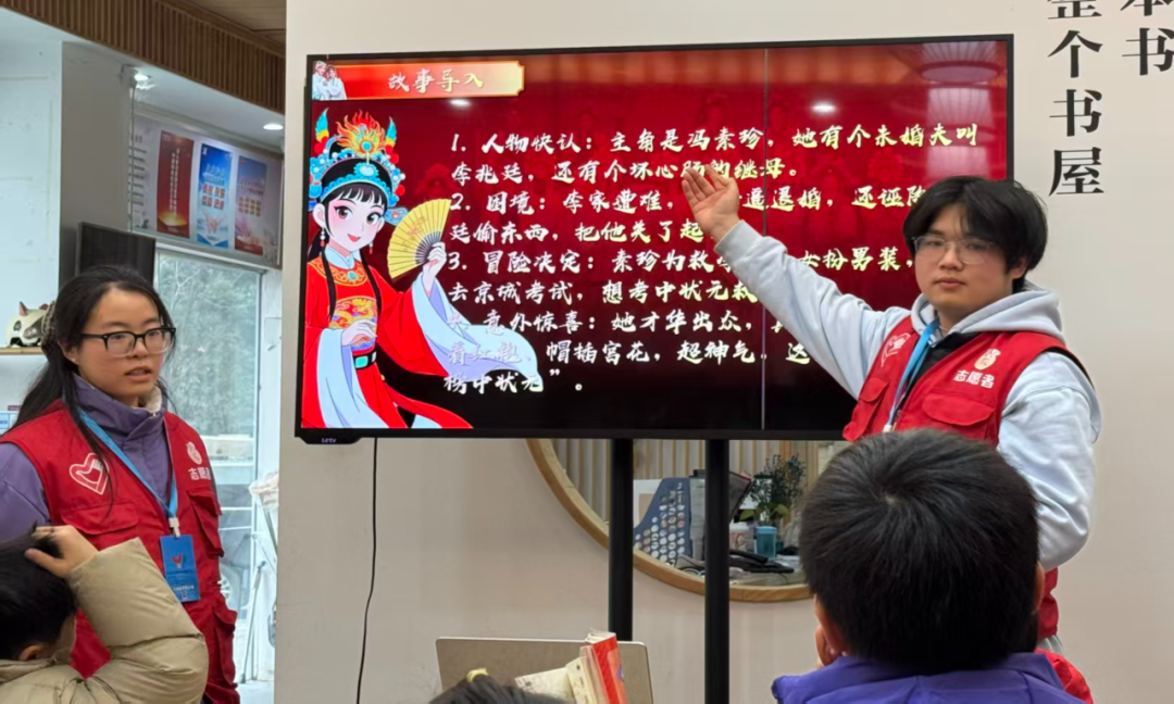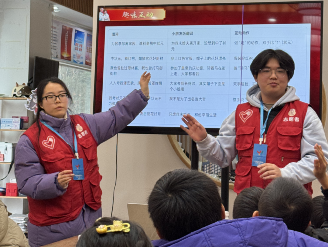 2026年2月4日下午,在湖北省宜昌市西陵区学院街道墨池巷社区“爱心托管班”内曲韵悠扬,一场别开生面的黄梅戏体验课正在精彩上演。音乐学院、黄梅戏学院大学生志愿者田潞瑶、吴伊凡走进社区,为孩子们带来一堂生动的传统文化课。通过讲解与教唱经典剧目《谁料皇榜中状元》,让非遗戏曲在童声中焕发新彩。
