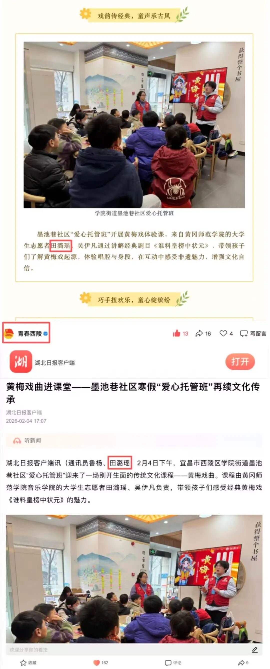 此次志愿服务活动获得了湖北日报、河南日报以及“青春西陵”微信公众号等多家媒体平台的关注与转发点赞,充分展现了我院学子扎根地方、服务社会的青春担当。家长们也纷纷给予好评,认为这样的课程既丰富了孩子的假期生活,又在孩子心中播下了热爱传统文化的种子。