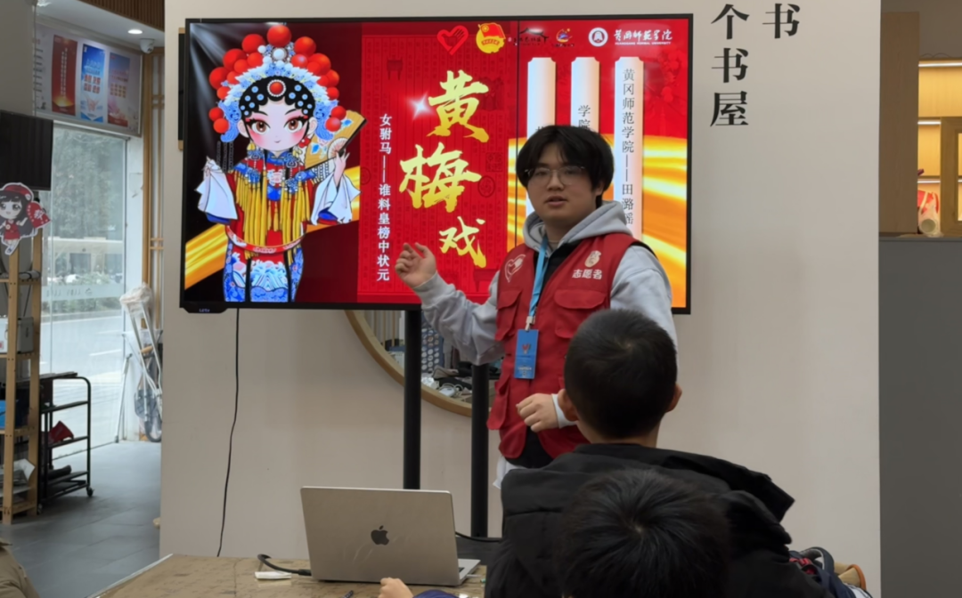 课堂上,田潞瑶与吴伊凡首先向孩子们讲述了黄梅戏作为国家级非物质文化遗产的起源与发展脉络。作为中国五大戏曲剧种之一,黄梅戏起源于湖北黄梅,其贴近生活、唱腔明快的特点迅速吸引了孩子们的注意力。