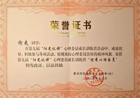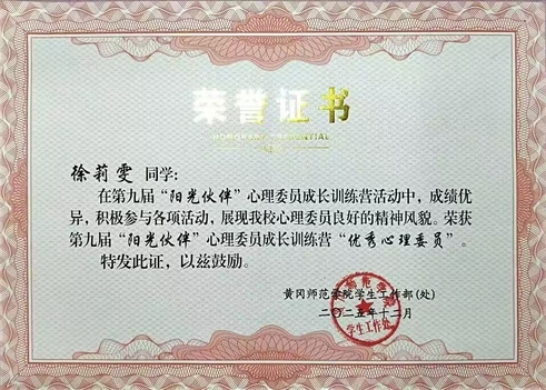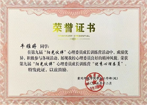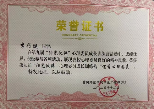 未来,我会把集训所学用在实处,多组织暖心心理活动,搭建倾诉小渠道,做好班级和心理中心的纽带,用真心做同学们信赖的心灵伙伴,不负优秀心委的称号。