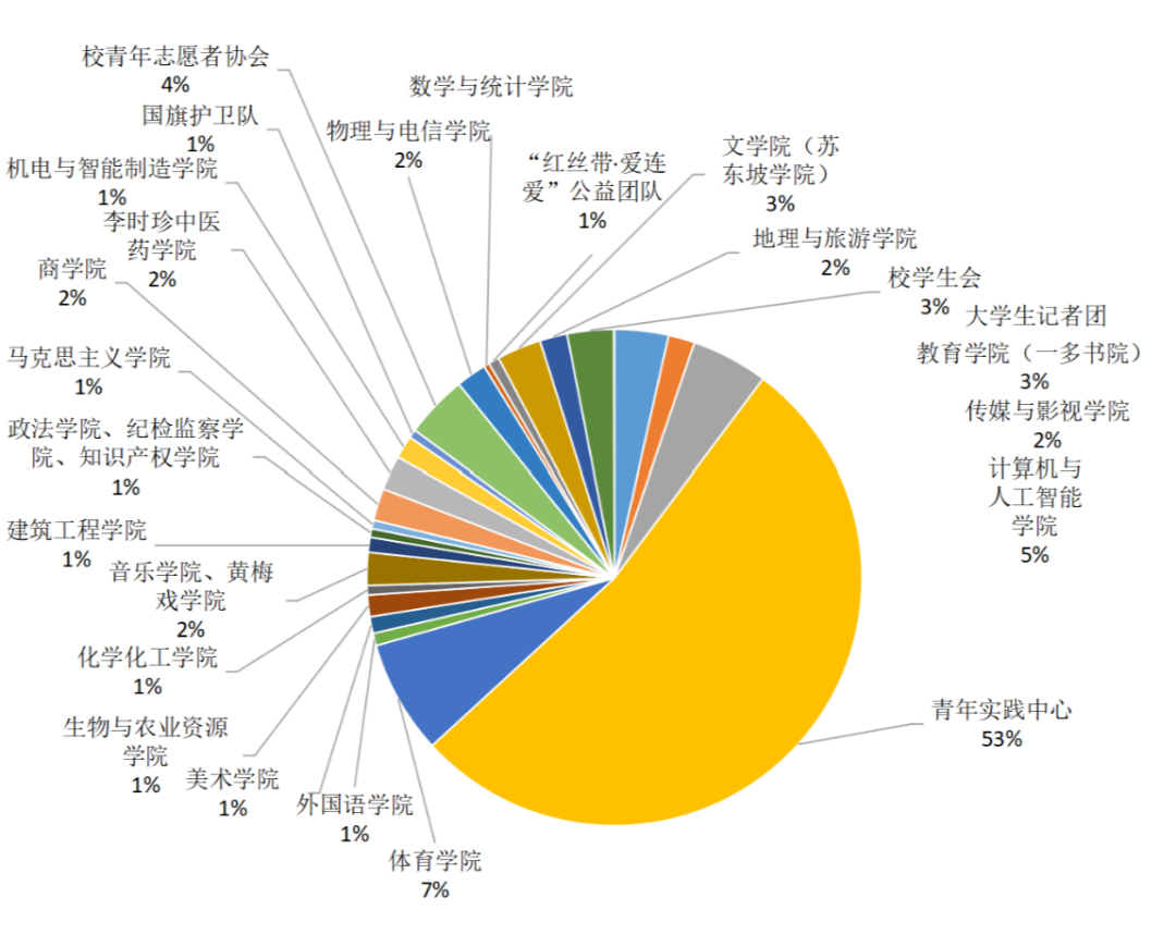 从各组织发布活动数量占比来看,青年实践中心发布活动数量最多,占比53%,其次体育学院发布活动数量较多,占比7%;其他各组织也能够积极开展各类志愿服务活动。希望各单位进一步强化责任担当,激发队伍干事活力,完善工作运行机制,统筹用好各类资源,深化部门协作配合,持续为事业发展增添新动力、凝聚新合力,在今后工作中奋力推动整体工作再上新台阶、再创新局面。