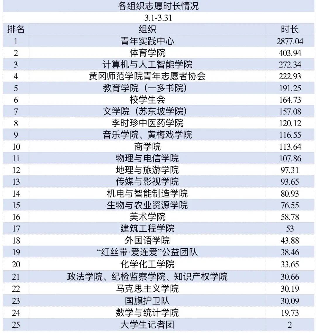 从各组织志愿时长排名来看,组织层面上,青年实践中心志愿时长暂列第一,主要开展事业编考试路面指引等志愿活动;从学院层面上来看,体育学院在各学院志愿时长中暂列第一,计算机与人工智能学院紧随其后。3月志愿活动中,各组织均能够积极组织开展志愿服务活动。希望各团队持续激发成员工作热情,完善常态化运行机制,提高资源利用效率,增强跨岗位协作本领,不断为组织发展注入新活力,在后续工作中努力为集体、为团队开创更美好的发展前景。
