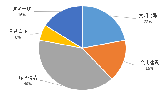 在志愿服务活动供给类型方面,学校类志愿服务活动占比72%,社区类志愿服务活动占比28%,学校类志愿服务活动占比有所上升。3月份志愿服务活动最大特色为雷锋月的清扫活动,本月以学习雷锋精神为核心开展重点志愿服务。志愿者们提前筹备、全程值守,在活动前期、教室清扫、秩序维护等环节主动作为,有效保障了活动的顺利展开,为教室清扫的进行提供了有力支持。3月份占比最大的是环境清扫类志愿服务活动,占比达40%,青年志愿者协会、青年实践中心、商学院等组织均积极开展了环境清扫类志愿服务活动。其他各类志愿服务活动也均有开展,其中文明劝导类和文化建设类志愿服务活动开展较多。希望各组织继续精心设计、敢于创新,让志愿活动形式更丰富、特色更鲜明构建多元化、有特色的活动体系,确保大学生在实践锻炼中切实增强综合素质与核心竞争力,助力每一位同学在奉献中收获扎实的成长足迹。