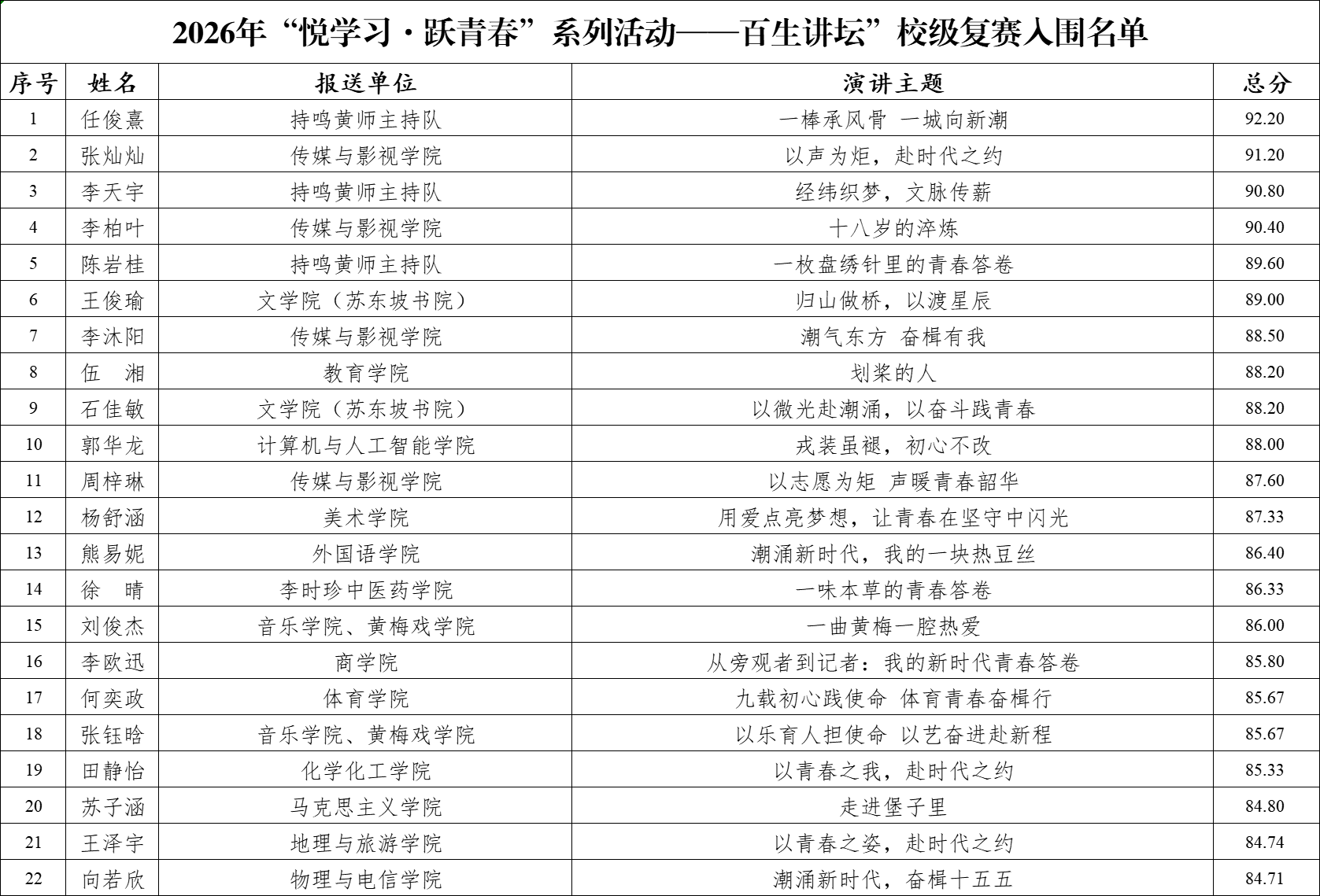 各学院(团委)共推选出57人参与校级初赛,现经民主评选、综合考量,评选出百生讲坛复赛入围名单共22人,现公示如下: