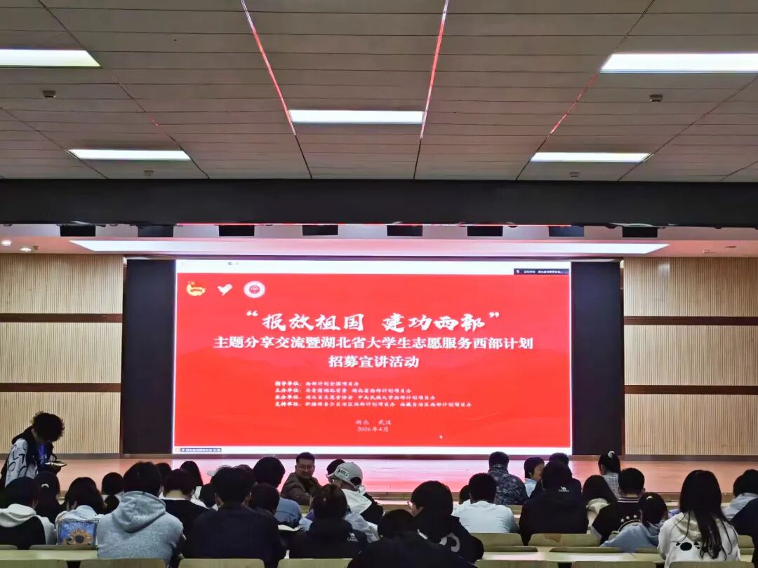 2026年4月9日19时,“报效祖国 建功西部”主题分享交流暨湖北省大学生志愿服务西部计划招募宣讲会在线举行。我校在北区一站式学生社区大学生活动中心设立分会场,组织师生集中观看。校团委书记陶莎、副书记汪珂,各学院团委书记、实践中心负责人及对西部计划有意向的应届毕业生、在读研究生参加了本次活动。
